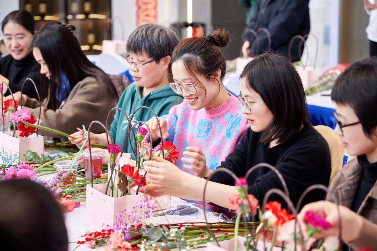 此次活動結合盛和公司房地產行業(yè)特點,將活動與樓盤推廣相結合。地點設在盛和公司與融創(chuàng)公司合作的平潮“潮啟未來”項目。活動邀請了花藝老師,給大家講授選花、裁剪、顏色搭配、造型等方面的插花技巧。一枝枝鮮花鋪在桌面上,大家在花藝師的指導下,進行嘗試和實踐。在一修一剪之間,桌上一盆盆細致精美、別出心裁的插花作品逐漸誕生。插花結束后,又舉辦了分享樓盤推廣點贊活動,將樓盤推廣信息在朋友圈內進行展示,在15分鐘內點贊最高6名女職工還可以得到特殊的獎勵。大家踴躍參加,發(fā)動親朋好友推廣點贊,活動現(xiàn)場歡聲笑語,你追我趕,進行了激烈的PK。